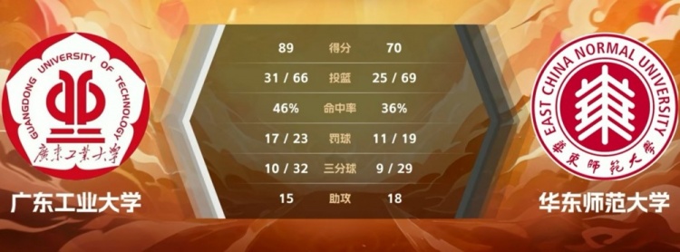 末节双方围绕15分的分差展开拉锯战,卢嘉俊三分再中,广东工大稳扎稳打保持优势,两队展开对攻,王乙丞强攻打中但加罚没有,崔俊超勾手迅速回应,曾煜成造成杀伤两罚全中后个人得分来到30+,随后三分还有,华东师大无力回天。最终,广东工业大学89-70击败华东师范大学。