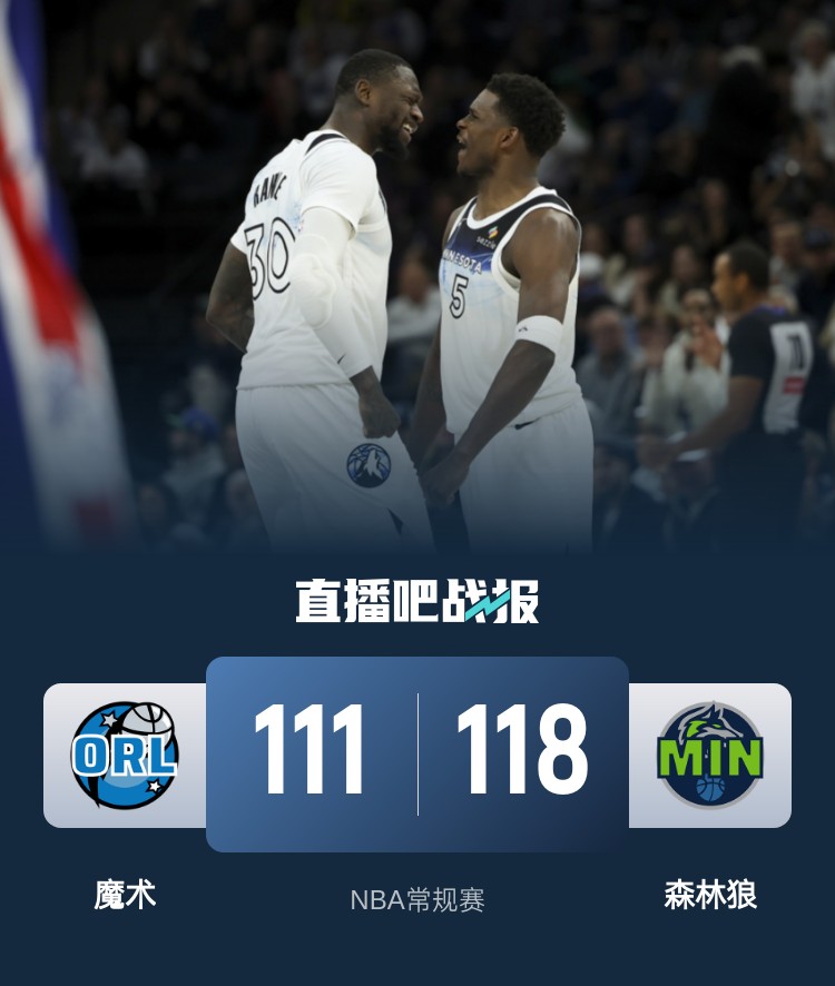 比赛开始后森林狼靠着兰德尔的发挥抢占先机,班凯罗早早进入状态连续拿分,爱德华兹毫不示弱也连续回应,场上比分交替上升。次节上来森林狼手感依旧不错内外开花,魔术也能够保持状态紧咬比分。易边再战,森林狼命中率开始下降,魔术在班凯罗和小瓦格纳的带领下掀起反扑将比分反超。最后一节魔术在小瓦格纳上来打进一球后就陷入运动战得分荒,森林狼轮换阵容打出15-1的高潮夺回领先。虽然此后班凯罗帮助魔术追平比分,关键时刻爱德华兹连得5分帮助森林狼再度建立领先,虽然班凯罗最后依旧不断砍分,但依旧未能帮助球队扭转败局,最终森林狼118-111击败魔术取得7连胜。