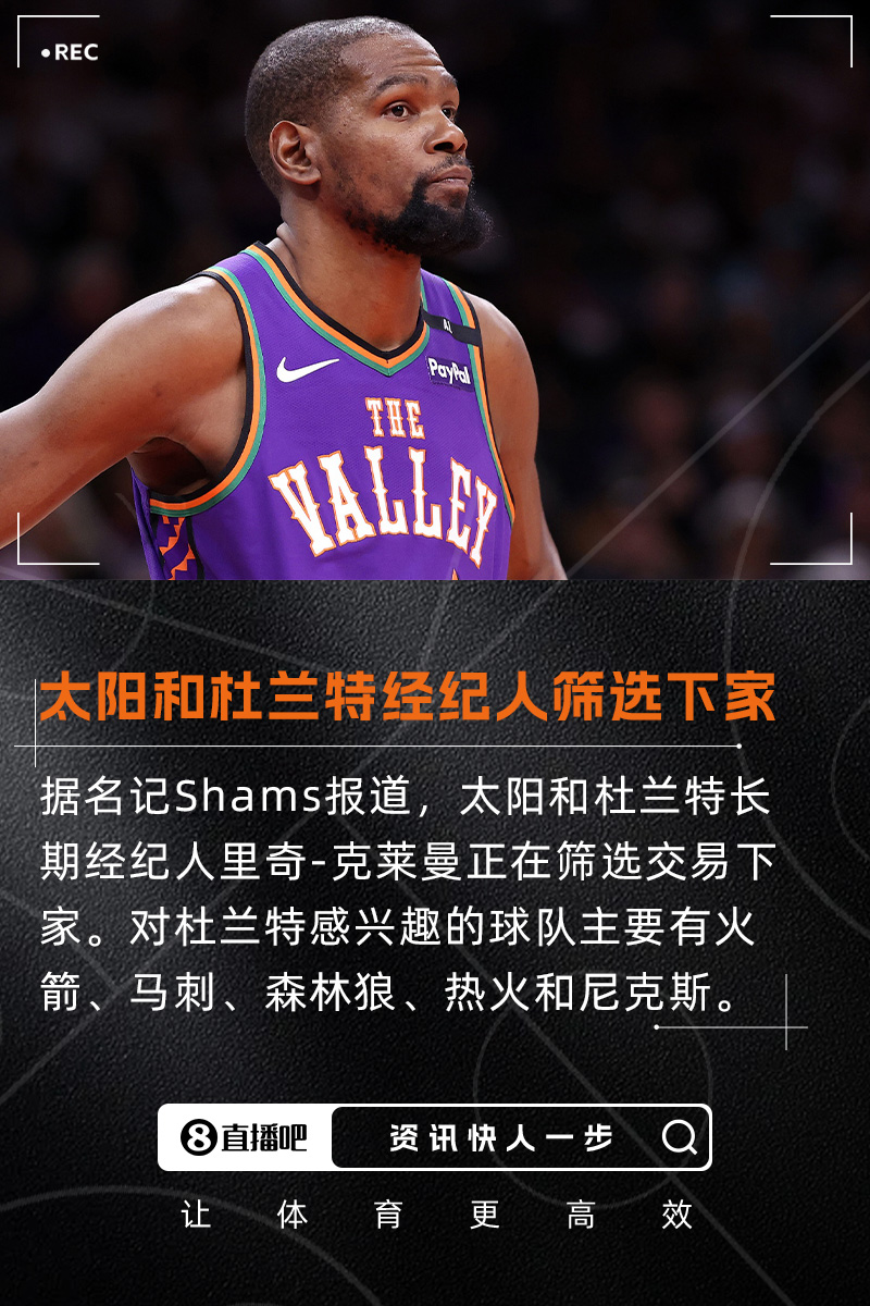 据报道,感兴趣的球队主要有火箭、马刺、森林狼、热火和尼克斯。据报道,还有几支潜在的追求球队在过去7-10天里联系过太阳讨论有关杜兰特的交易。