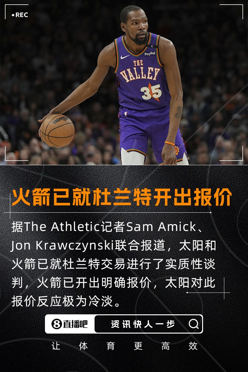 球队多位消息人士表示,火箭和太阳就杜兰特的交易进行了实质性谈判,火箭已经开出了一份明确的报价,但太阳目前对此报价(交易方案)反应极为冷淡。