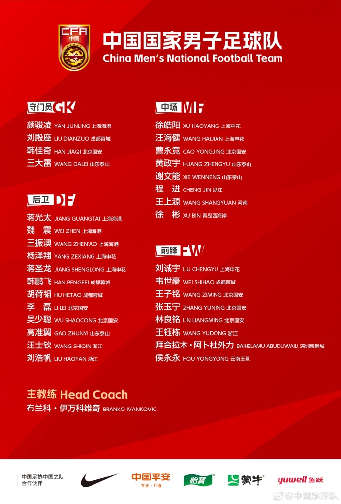 前锋:刘诚宇(上海申花)、韦世豪(成都蓉城)、王子铭(北京国安)、张玉宁(北京国安)、林良铭(北京国安)、王钰栋(浙江)、拜合拉木(深圳新鹏城)、侯永永(云南玉昆)