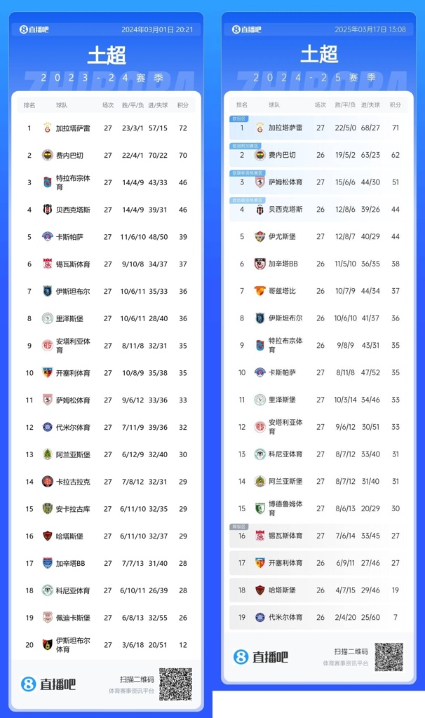 到了本赛季,加拉塔萨雷延续无敌的表现,27场比赛后拿到71分,只比去年少1分,但费内巴切却有一些掉队了。尽管目前费内巴切少赛一场领先第3名也有11分之多,但落后榜首加拉塔萨雷已9分。今年费内巴切的争冠形式并不乐观,二人转的局面渐渐有些偏向独角戏了…
