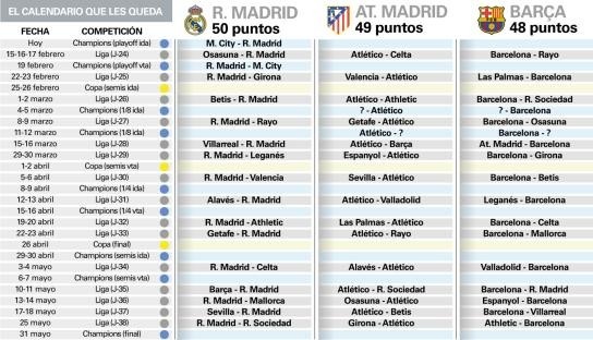 目前皇马依然以50分领跑西甲,领先马竞(49分)和巴萨(48分)。但皇马的赛程显然更为艰难,尤其是在二月。欧冠淘汰赛附加赛,他们将对阵曼城——首回合就将在今晚打响。在这两回合的附加赛中间,他们还要前往客场对阵奥萨苏纳。之后在主场迎战赫罗纳与客场对阵贝蒂斯的联赛中间,又有一场国王杯半决赛的首回合。
