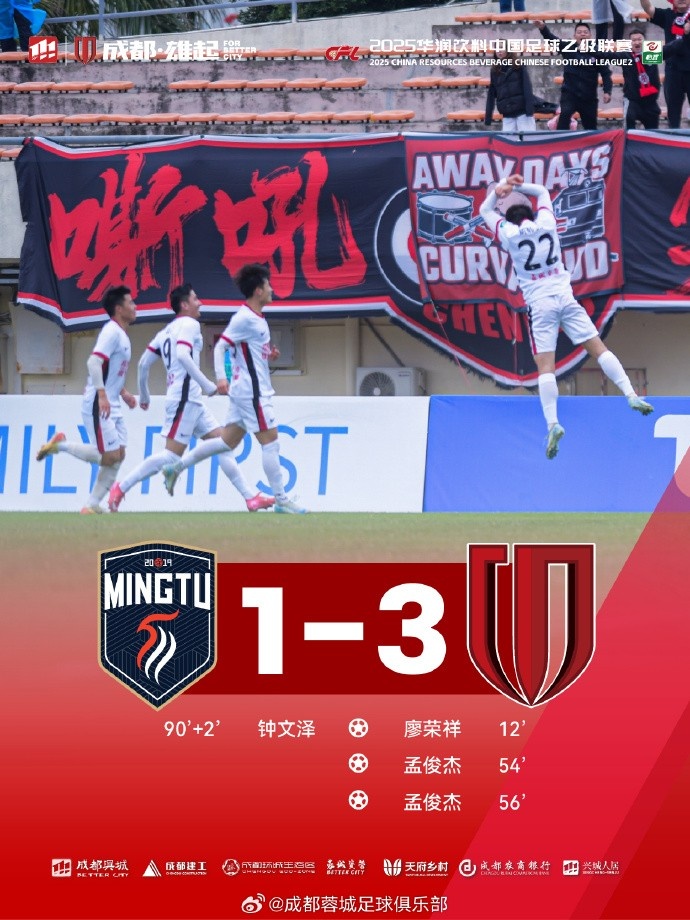 在今天下午进行的中乙第2轮成都蓉城B队与广东铭途的比赛中,上半场,孟俊杰创造点球机会,廖荣祥点射破门;下半场,孟俊杰3分钟内梅开二度,广东铭途补时阶段扳回一球。最终,成都蓉城B队3-1击败对手,收获两连胜。