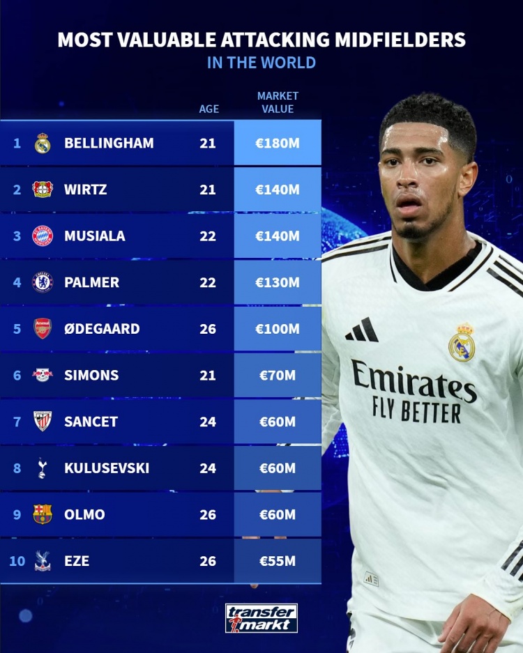 4月7日讯 德国转会市场今天列出世界足坛进攻型中场身价排名,贝林厄姆1.8亿欧元居首,5名球员身价破亿。