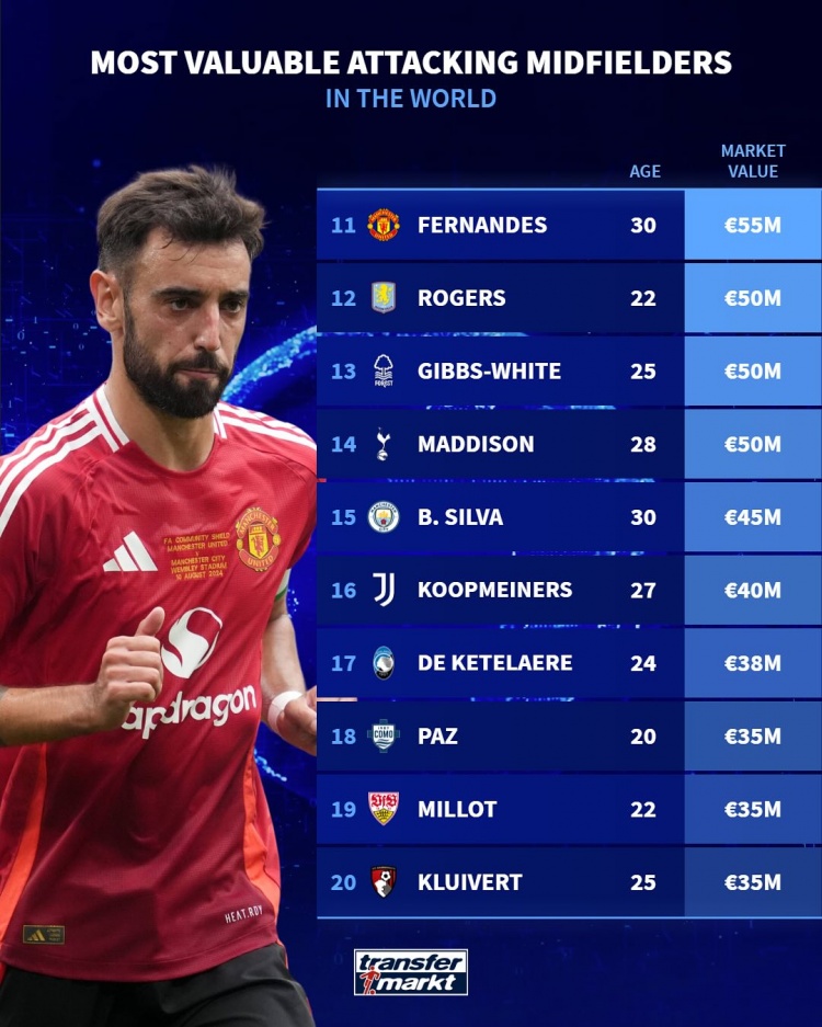 10、布鲁诺-费尔南德斯(曼联),30岁,5500万