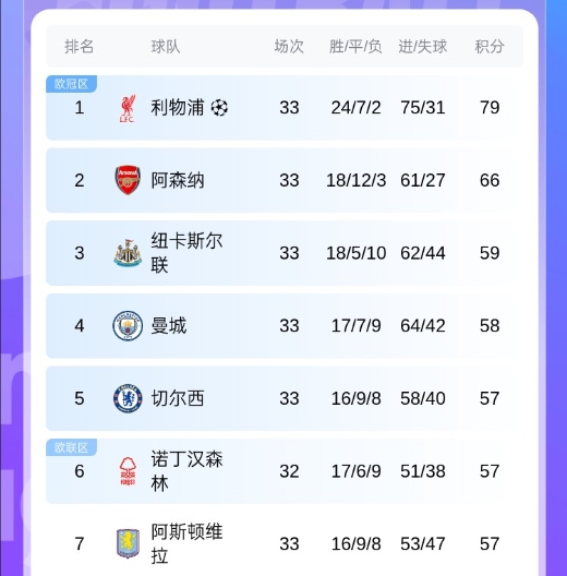 04月21日讯 英超33轮过后,欧冠名额的争夺进入白热化,第三名纽卡和第七名维拉的分差只有2分,而英超前五都能获得下赛季的欧冠资格。