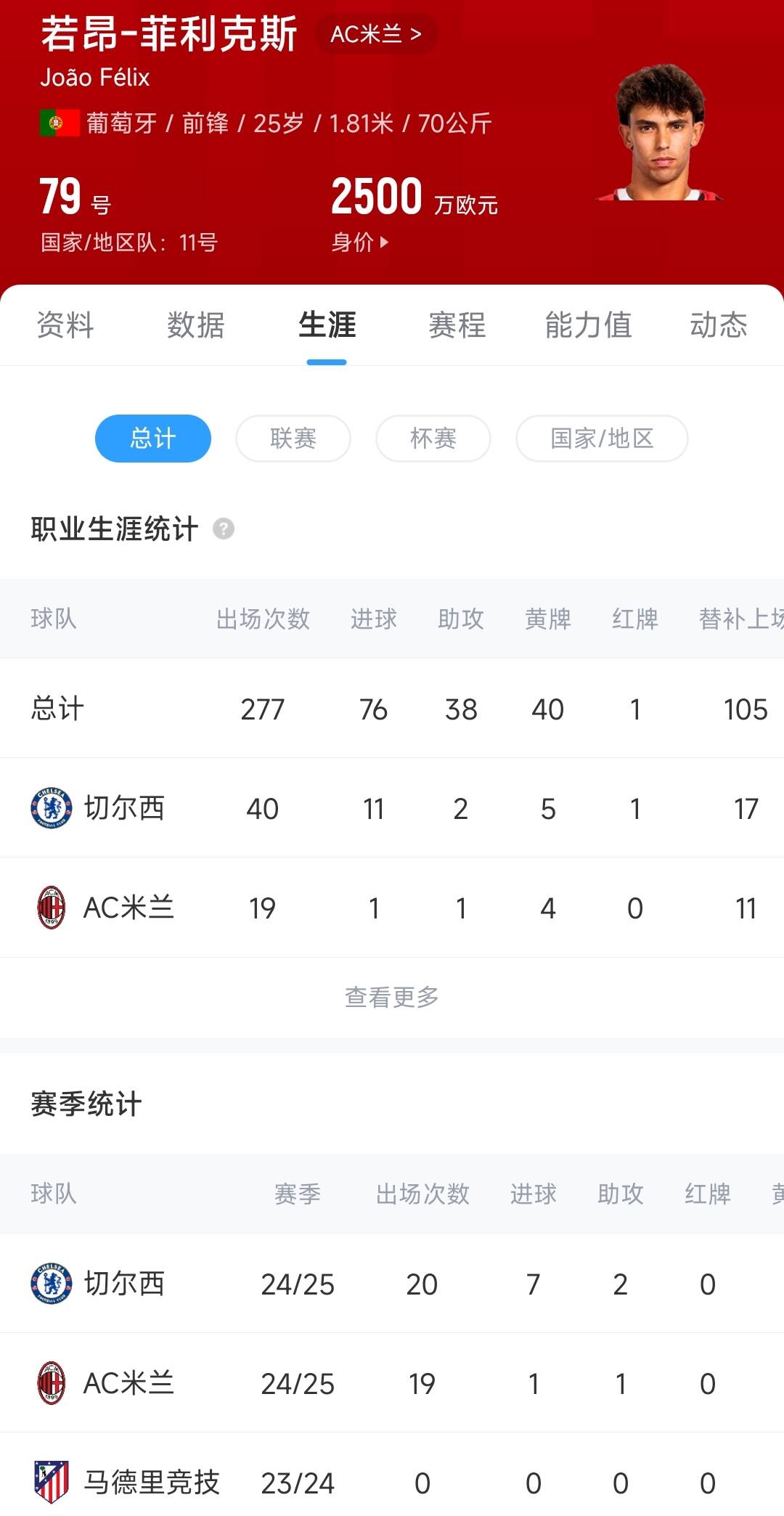 2023年1月,菲利克斯租借加盟切尔西,开启了自己的流浪生涯。两年间菲利克斯先后辗转马竞、巴萨、切尔西、AC米兰4支球队,但在每支球队效力都没能超过半年。目前25岁的菲利克斯德转身价为2500万欧元,而在19岁时,菲利克斯的最高身价曾达到1亿欧元。