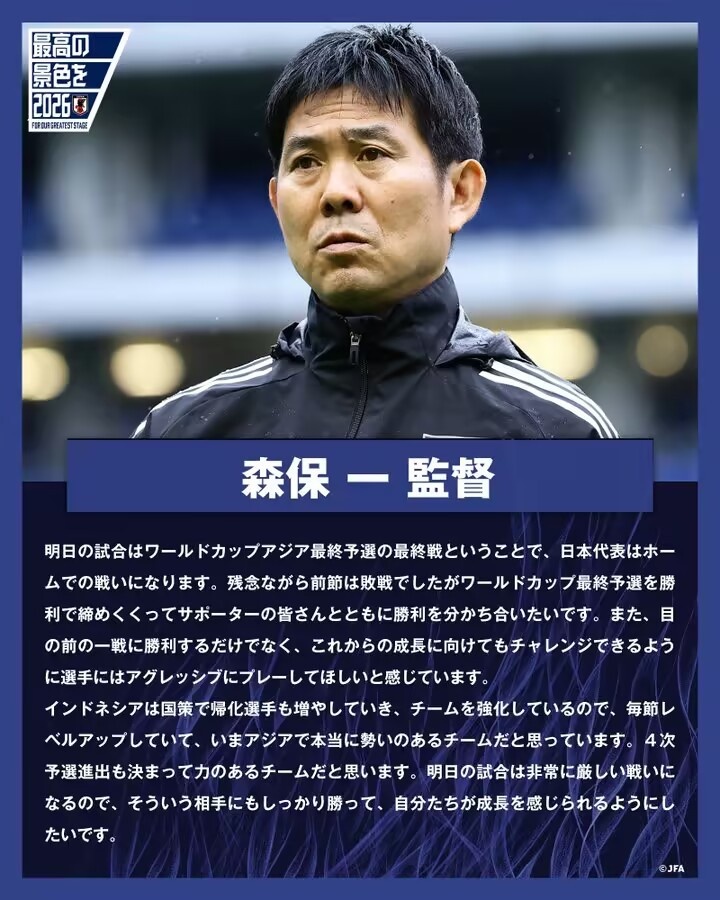 6月10日讯 北京时间今晚18:35,18强赛收官战日本队将在主场迎战印尼队。在昨日训练间隙,日本队主教练森保一接受了日本队官方采访,谈到了本场比赛。