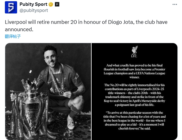 俱乐部在文章中表示,这位“20号”将永远被铭记,一些球迷和媒体转发时则表示利物浦将退役20号球衣。